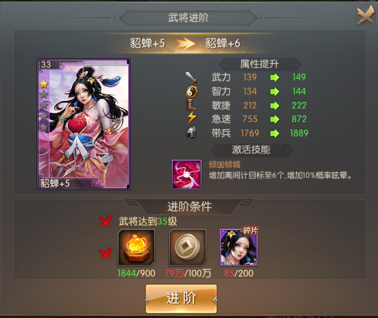 貂蝉、赵云为平民及中小R主要培养的不2人选,前期战场收割机,谁用谁知道。游戏里的大部分武将只有+6才能发挥奇效,所以一定要优先进阶6.