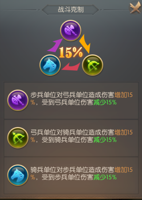 弓兵克骑兵、骑兵克步兵、步兵克弓兵。