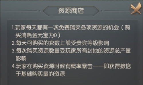 3.其它资源获取方式:每天商城的低价资源可以按需购买,地图剿匪任务也可以获得资源包,注意在背包里使用,另外三十级开启挑战功能之后可以掠夺其他玩家的资源,或者占领资源矿产。