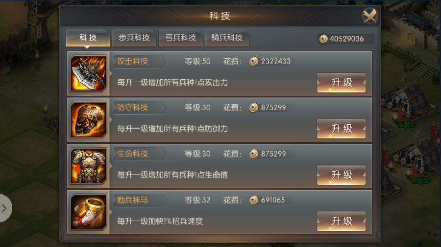 2.在国家没打四级城之前,1级兵就够用(2级兵能打关内所有城)。金币用来提升攻击和防御科技,各到20级(开2级士兵和兵种科技)前期专注升级兵种科技里的一类。我们造兵就要单一化,加成享受更全面;