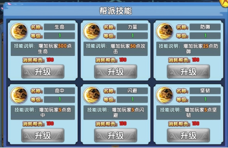 7、帮派技能:当玩家进入帮派后,帮派技能系统开启;系统开启时所有技能都是默认1级;总共有5个帮派技能,所有帮派技能都是被动,只要升级了就永久增加玩家对应的属性;帮派技能只针对玩家自身,不会因为玩家退出帮派或者加入其他帮派而改变;一个帮派技能只增加一种属性;帮派技能使用帮贡进行升级。