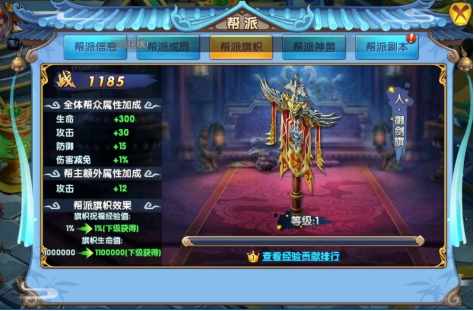 2、帮派旗帜:帮派旗帜有等级,可升级,帮派旗帜有属性,升级后属性增加。旗帜升级:帮派旗帜有自己的经验条,当经验条满了之后,帮派旗帜自动升级。帮派旗帜的经验值来源主要有三个,完成帮派每日任务,每一位帮派成员完成当日所有的帮派每日任务后,即可为帮派旗帜增加经验值;参加帮派的相关活动,每一位参加过的帮派成员都可为帮派旗帜增加经验值;召唤神兽,召唤神兽并且成功击败后,帮派旗帜增加经验值。