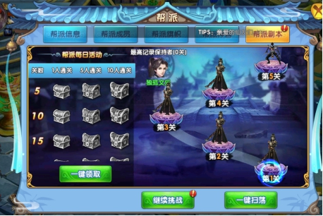 4、帮派副本:帮派副本有层数,帮派成员通关层数越高,全帮派成员可获得的奖励越高;副本每天刷新一次;通关副本有奖励,包括个人首次通关奖励,帮派全员通关奖励。