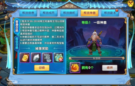 3、帮派神兽:帮派神兽主要分为喂养和召唤两大功能。