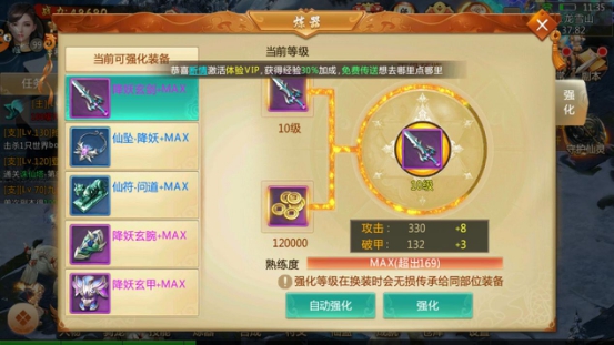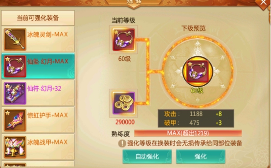 自动强化:把装备自动强化到你当前所能强化到的最大值。
