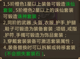 2、玩法说明:套装主要分为防具套装和仙器套装,五阶橙色1星以上可锻造诛仙套装,五阶橙色2星以上的诛仙套装可锻造诛神套装,当套装集齐到一定数量可激活套装属性;