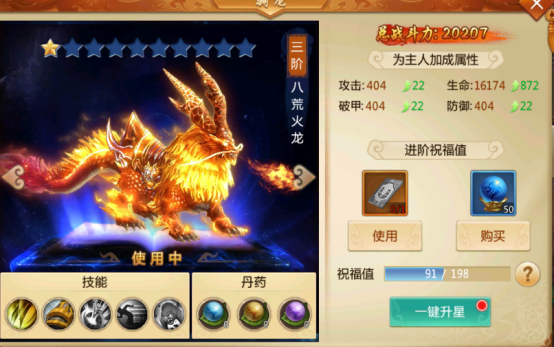 当我们有足够的坐骑进阶丹就可以通过点击一键升星来进阶坐骑了!