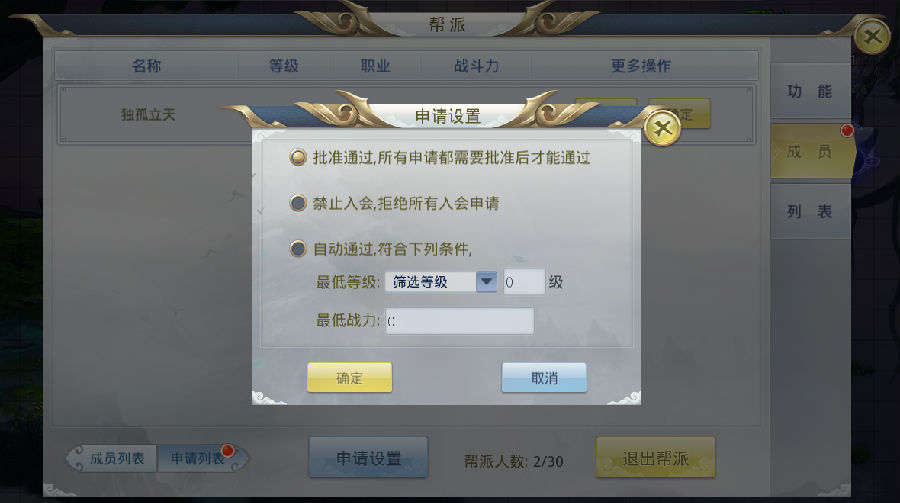 申请列表——显示当前申请入帮的玩家列表,如果勾选“自动批准入帮”,则无需批准,玩家点击申请即可进入帮派,如果您有更换帮派的打算,在这个界面的右下角可以点击退出帮派~