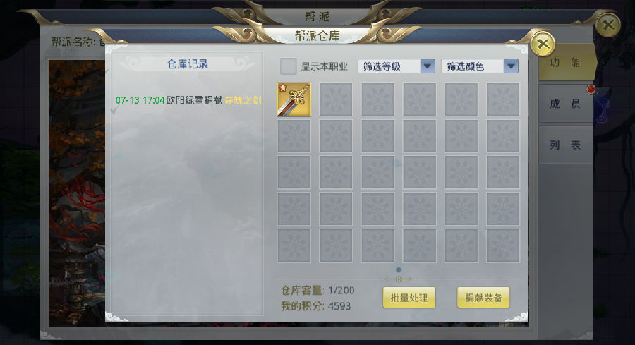 批量处理——仓库满了怎么办?帮主和副帮主这时候就可以用到批量处理的按钮,可以销毁掉品质过低的装备,腾出空间来存放高级装备,帮助大家更好的成长。