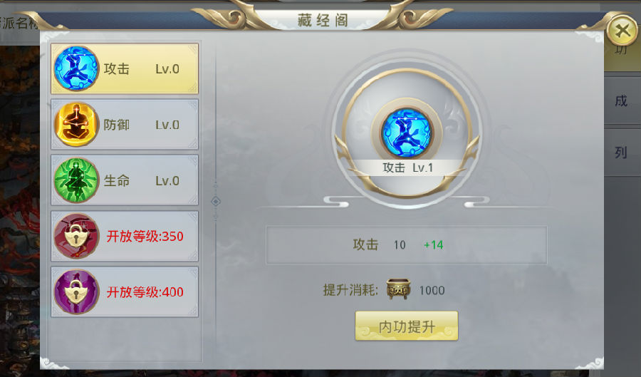 提升人物属性的重要途径。帮派中内容的界面非常简洁,只需要在左边选择需要升级的属性,然后在右边点击提升内功即可。升级所需的帮派贡献可以通过每周重置的帮派任务来获取,一定不要忘记做哦!