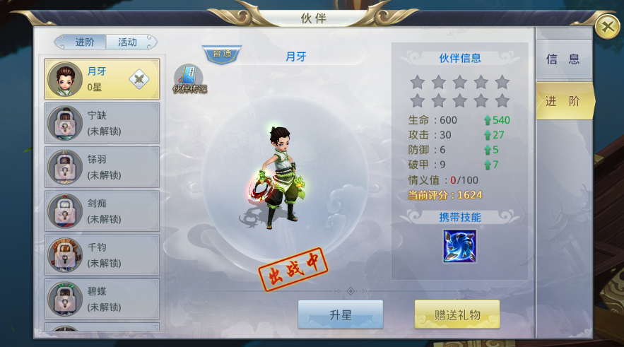伙伴旁边有星级,当星升满了之后伙伴就能进阶到下一阶段。而星级下方的伙伴属性则是伙伴目前的属性。进阶最常用到的道具“糖葫芦”跟“拨浪鼓”可以在商城买到,任务奖励或者通过副本“伙伴副本”获得。