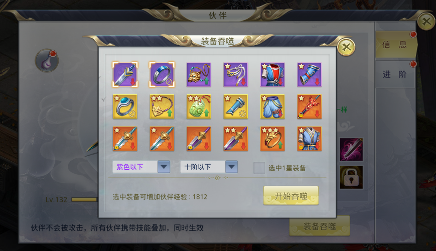 装备吞噬则是通过把不需要的装备以及易经丹喂给伙伴来提升伙伴等级,不要手滑喂掉有用的装备就好。