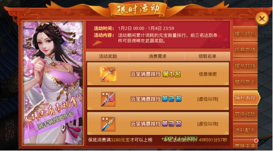 活动说明:绝世神兵重现江湖,活动当天消费排行第一名的玩家即可领取绝世神兵“传说之剑”,二三名可领取极品武器(活动结束后奖励通过邮件发放)