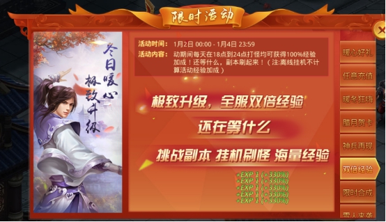 活动内容:打怪双倍经验,奖励大翻倍。活动期间每天的18:00-24:00开启双倍经验活动,快来挂机刷怪、刷经验本吧!抓紧机会不要错过!