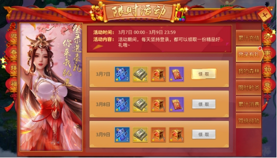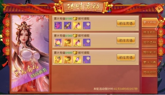 活动内容:活动期间累计充值达到指定额度,即可领取超多极品奖励!!经验副本挑战券、3倍经验药等你来拿!