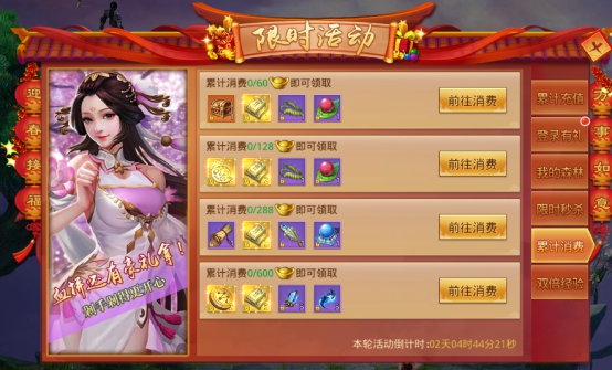 活动内容:活动期间累计消费达到指定额度,即可领取超多极品奖励!!经验副本挑战券、探宝道具等你来拿!