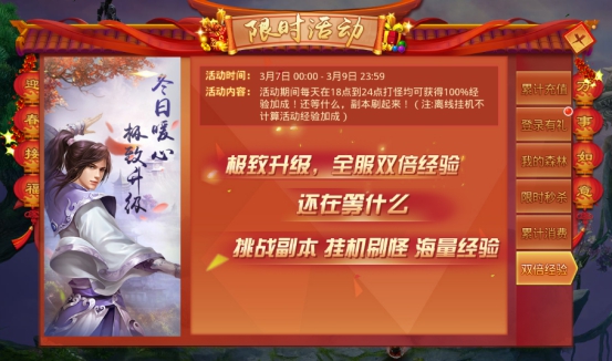 活动内容:打怪双倍经验,奖励大翻倍。活动期间每天的18:00-24:00开启双倍经验活动,快来挂机刷怪、刷经验本吧!抓紧机会不要错过!