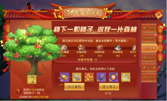 活动内容:3月11-12号,每天通过完成日常活跃度达到100领取一颗种子,领取后可前往庄园进行播种,邀请好友浇水可加快成熟时间,也可偷取其他玩家的果实,果实可用于捐赠获得随机奖励,全服达到指定次数还会触发全服事件哦~