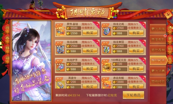 活动内容:活动期间0点、12点会刷新两波秒杀道具,极品橙二星装备、绝版小年专属剑魂·金鲤戏波限时秒杀!数量有限,先到先得!