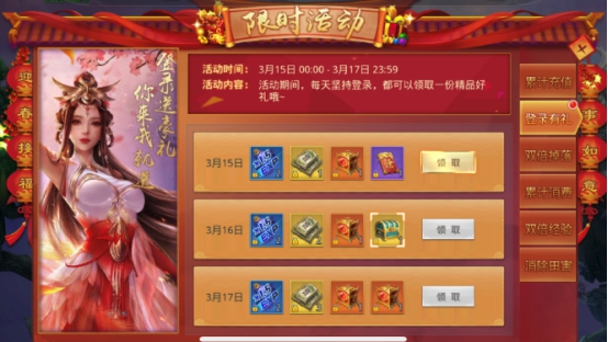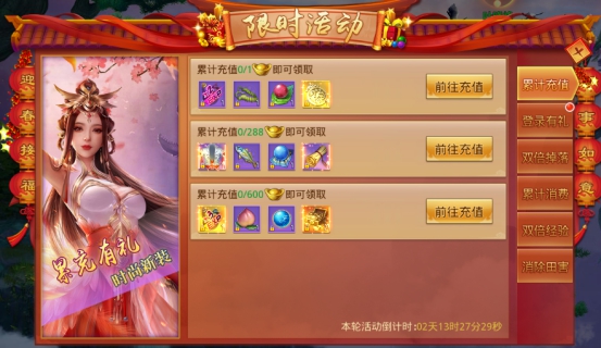 活动内容:春耕季节,充值送豪礼!活动期间累计充值达到指定额度即可领取对应奖励!超强属性丹、3倍经验药、经验副本挑战券等你来拿!!!