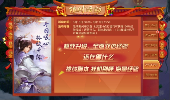 活动内容:打怪双倍经验,奖励大翻倍。活动期间每天的18:00-24:00开启双倍经验活动,快来挂机刷怪、刷经验本吧!抓紧机会不要错过!