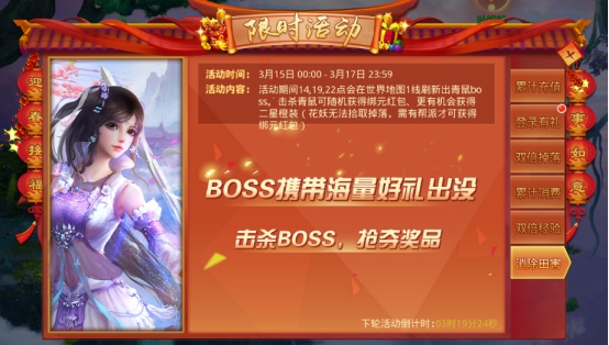 活动内容:活动期间的14点、19点、22点都会在挂机地图1线刷出青鼠boss,boss携带大量橙色二星装备、绑元红包哦!!!