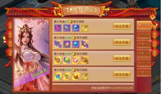 活动内容:充值送豪礼!活动期间累计充值达到指定额度即可领取对应奖励!超强属性丹、3倍经验药、绝版时装、高级宝石、经验副本挑战券等你来拿!!!
