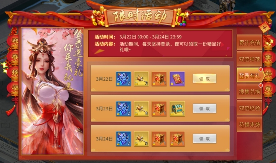 活动说明:活动期间,100级以上的玩家在活动期间每天登录都可领取登录礼包!!!