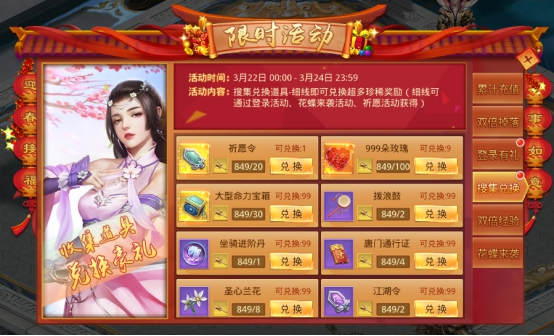活动内容:活动期间通过登录活动、花蝶来袭、欢乐祈愿都可以获得兑换道具-细线,使用细线即可兑换超过奖励哦!!!