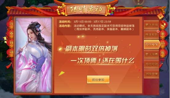 活动内容:活动期间全天挑战指定副本可获得双倍物品掉落(17号限伙伴副本、洗炼副本、装备副本、巅峰副本,18号限剑心副本、佩饰副本、侠侣副本、银两副本)