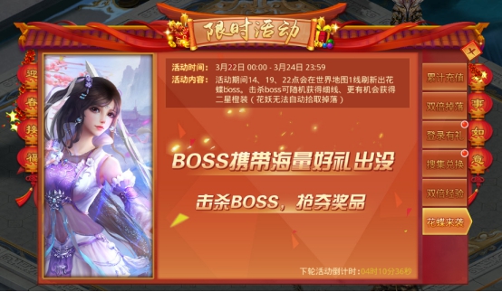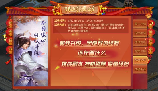 活动内容:打怪双倍经验,奖励大翻倍。活动期间每天的18:00-24:00开启双倍经验活动,快来挂机刷怪、刷经验本吧!抓紧机会不要错过!
