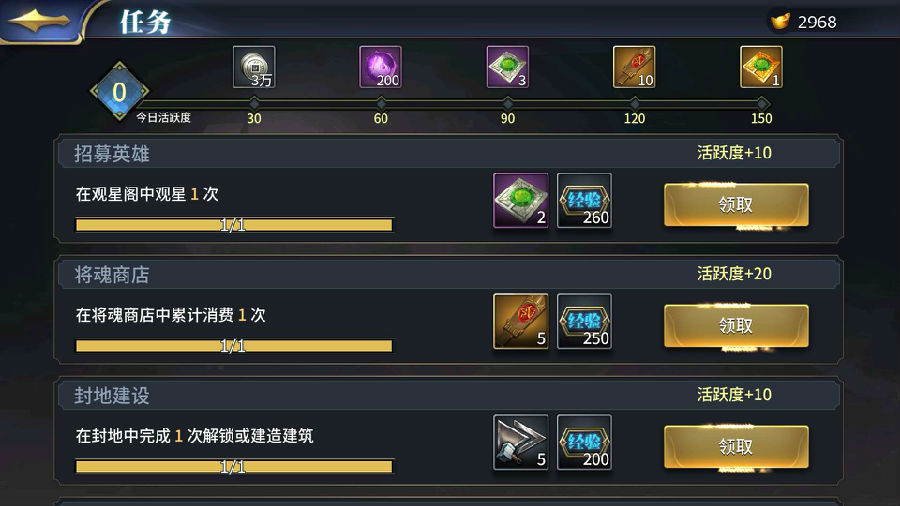 目前游戏内获取主公经验的方式有:主线剧情任务,每日任务,封地建筑升级,演武场,名将台