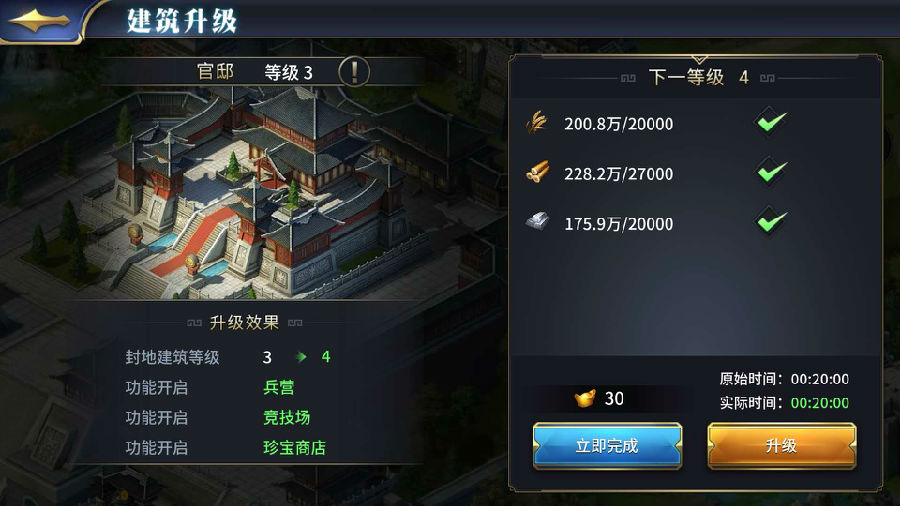 所以,能够在玩家之间拉开等级差距的,主要集中在“封地建筑升级”,“演武场”和“名将台”
