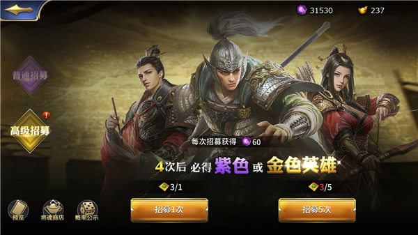 观星阁分为普通招募和高级招募。普通招募必须使用“星盘”才能招募,最多只能招募紫色武将,难得会出金色武将碎片。而高级招募使用的是“高级星盘”和黄金招募,会大概率出金色武将或碎片。
