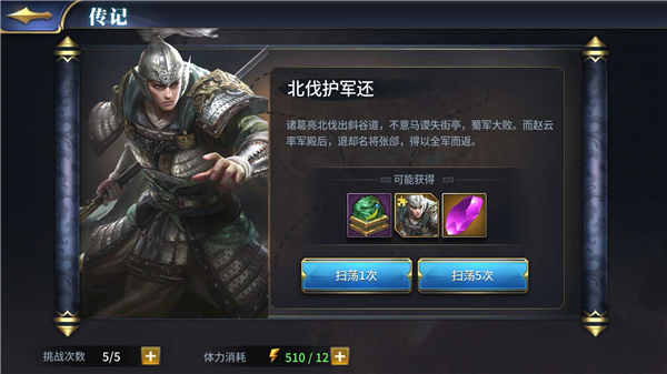 但是大家需要注意是,通关一个副本是需要消耗体力的,这里建议大家只扫荡自己重点培养武将的那个关卡,其他关卡无视掉。把剩余体力花费在演武场,获得军械提升军阶。