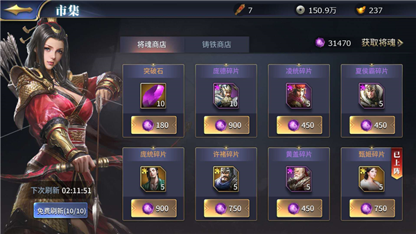 这里需要注意,市集的武将碎片是随机,可能需要通过不断刷新才会自己培养的武将碎片。这点不用担心,游戏每天会免费赠送10次刷新,并且完成每日任务能获得5个刷新令,总归每天有15次免费刷新的机会。所以请大家好好利用吧~