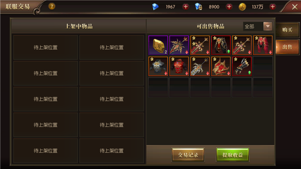 玩家可以在出售界面上架自己所想要出售的游戏道具。同时,也可以在这里查看交易记录和提取收益!