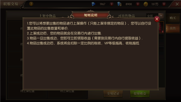 4、物品出售成功后,系统将会扣除一定比例的税收,VIP等级越高,收税越低。