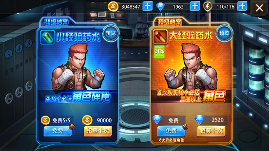 顶级档案:每天可免费抽取1次,招募一次花费280钻石,招募十次花费2520钻石。在顶级档案里有几率抽取到覃欢喜、爆Seed、司徒烈、卓凯、丁小嘉、猜Fing、挞沙、林希微、安琳、Kobe、叶兆良、Ada、郭学华、阿火、木虱、洛威拿、阿狗、鬼王超、崇金、莫羡昕、康道行、莫羡晴、单欣菲等英雄,以及升品药剂、经验药水(顶级、豪华、中)、100000元钞票、500000元钞票、万能碎片。