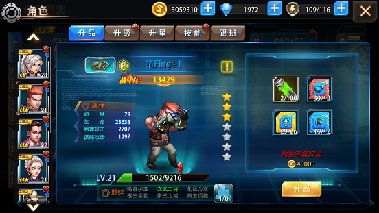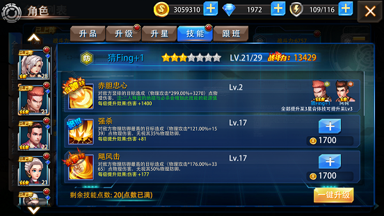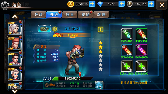 升级:可以消耗升级材料来提高英雄等级,英雄等级不能高于游戏等级。