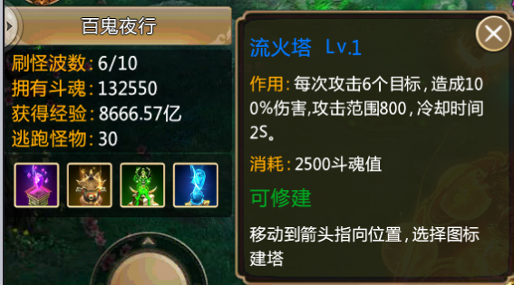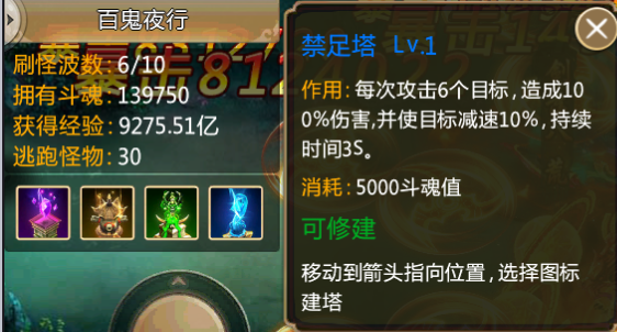 而天雷塔由于其建造成本较低,前期也可以大量建造。前期靠着低级的塔及人物的输出,可以很好的消灭怪物,在攒够足够的斗魂时则可以将塔升级或者换到流火塔或禁足塔去限制怪物的血量和走位,方便游戏角色更好地消灭怪物。