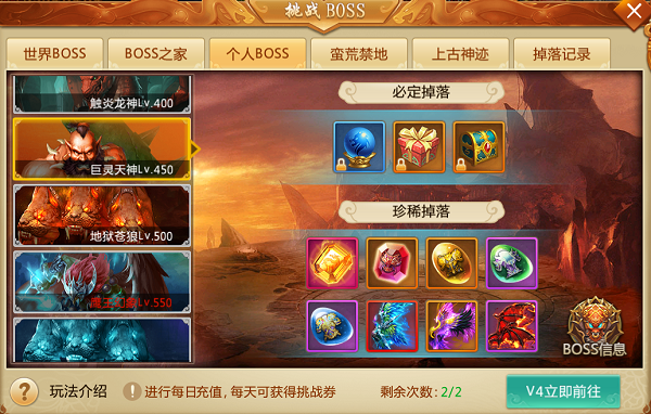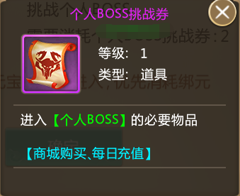 查看界面:【挑战BOSS】-【个人BOSS】标签页