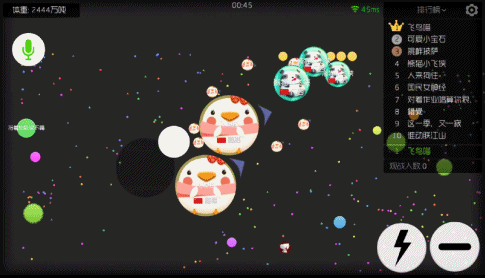 刚开始接触这款游戏的时候,咪宝以为还需要一定的时间去适应,没想到这款游戏却是简单到上手即会。我们只需要在屏幕中的圆点区域通过触控来改变方向就可以了。如果发现比自己大的球我们就要左闪右躲,迅速闪避。发现比自己小的球就要迅速追击,将其吞噬。这是不依靠任何道具的最直接的对战,狭路相逢时,胖者胜!