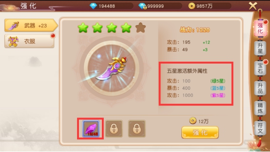 每次强化都会消耗强化石,升级5次会增加一颗星,达到五颗星会额外激活属性。