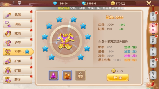 每次升星都会消耗升星石,升级1次会增加一颗星,达到十颗星会额外激活属性。