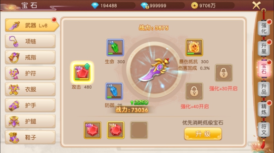 宝石镶嵌装备,提升战力,每件装备有六个宝石孔,对应六种类型的宝石,每个孔可镶嵌一颗宝石;随装备强化等级开放宝石孔;宝石镶嵌后可获得属性加成;宝石套装到一定条件有额外属性加成。