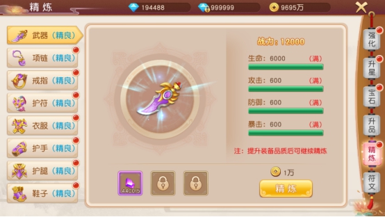 每次精炼都会消耗精炼石,每次精炼会随机增加装备里任意一项属性点;随着装备升品的品质提高会随之增加属性值。