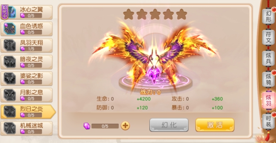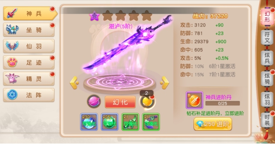 跟侍宠的幻形不同,幻形系统中的幻形决定的是角色自身的外观,神兵、坐骑、仙羽、足迹、精灵、法阵可以消耗对应的进阶丹提高阶级获得属性,每达到一个阶级即可解锁不同的外观,可以选择自己喜欢的外观自由幻化。