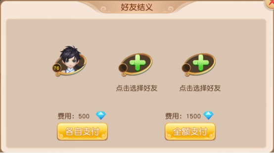 结义前只要支付一定的费用,可以选择三人分别支付500钻石,或者一人全额支付1500钻石。