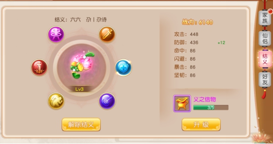 行走三界,一定要靠朋友,遇到知己就要结义。结义需要三位侠士,结义成功后三人都会获得专属的时装、称号、义之信物。